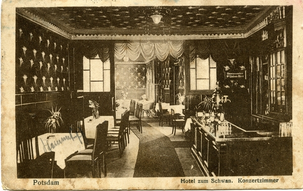 Text auf der Karte: Hotel zum Schwan Restaurant und Café Bes. Marta Schultz - Konzertzimmer Entstehungszeit der Karte: gestempelt Potsdam ca. 1925 Straße und Hausnummer: Waisenstraße (heute Dortustraße) 13 Kartenart: Ansichtskarte Kartentechnik: Kupfertiefdruck Verlag: 854 Foto u. Verlag Max Hochgeladen, Potsdam Gelaufen/ungelaufen: gelaufen Zustand (I=sehr gut bis V=mangelhaft): III Häufigkeit (h=häufig bis rrr=sehr selten): h Heutige(r) Straßenname(n): Dortustraße