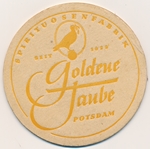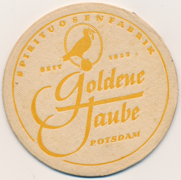 Text auf der Karte: Bierdeckel Spirituosenfabrik Goldene Taube seit 1822 Entstehungszeit der Karte: ca. 1930 Straße und Hausnummer: Jägerstraße 6 Kartenart: Bierdeckel Kartentechnik: Farbdruck Verlag: unbekannt Gelaufen/ungelaufen: ungelaufen Zustand (I=sehr gut bis V=mangelhaft): I Häufigkeit (h=häufig bis rrr=sehr selten): h Heutige(r) Straßenname(n): Jägerstraße (Potsdam-Stadt)