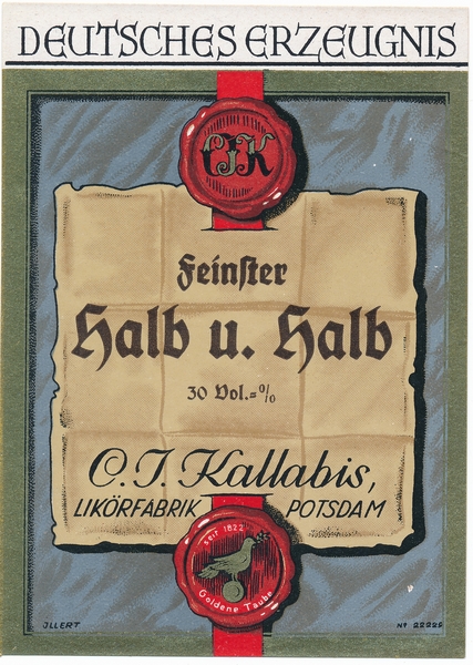 Text auf der Karte: Etikett Deutsches Erzeugnis Feinster Halb u. Halb 30 Vol.=% C. J. Kallabis Likörfabrik Potsdam Goldene Taube seit 1872 Entstehungszeit der Karte: vor 1964 Straße und Hausnummer: Jägerstraße 6 Kartenart: Etikett Kartentechnik: Druck Verlag: Illert Gelaufen/ungelaufen: ungelaufen Zustand (I=sehr gut bis V=mangelhaft): I Häufigkeit (h=häufig bis rrr=sehr selten): r Heutige(r) Straßenname(n): Jägerstraße (Potsdam-Stadt)