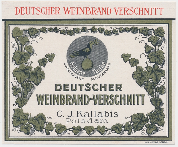 Text auf der Karte: Etikett Deutscher Weinbrand Verschnitt C. J. Kallabis Likörfabrik Potsdam Goldene Taube Eingetragene Schutzmarke Entstehungszeit der Karte: vor 1930 Straße und Hausnummer: Jägerstraße 6 Kartenart: Etikett Kartentechnik: Druck Verlag: Hermberg, Lübeck Gelaufen/ungelaufen: ungelaufen Zustand (I=sehr gut bis V=mangelhaft): I Häufigkeit (h=häufig bis rrr=sehr selten): r Heutige(r) Straßenname(n): Jägerstraße (Potsdam-Stadt)