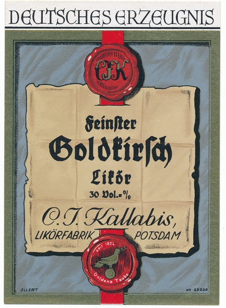 Text auf der Karte: Deutsches Erzeugnis Feinster Goldkirsch Likör 30 Vol.=% C. J. Kallabis, Likörfabrik Potsdam