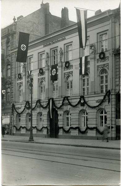 Text auf der Karte: Städtische Charlottenschule rückseitig vermerkt: Zur Reichstagseröffnung aufgenommen am 21. März 1933 Entstehungszeit der Karte: aufgenommen 21.03.1933 Straße und Hausnummer: Charlottenstraße 33 (heute: 31) Kartenart: Fotokarte Kartentechnik: SW-Foto Verlag: Ernst Eichgrün, Potsdam Gelaufen/ungelaufen: gelaufen Zustand (I=sehr gut bis V=mangelhaft): I Häufigkeit (h=häufig bis rrr=sehr selten): rr Heutige(r) Straßenname(n): Charlottenstraße