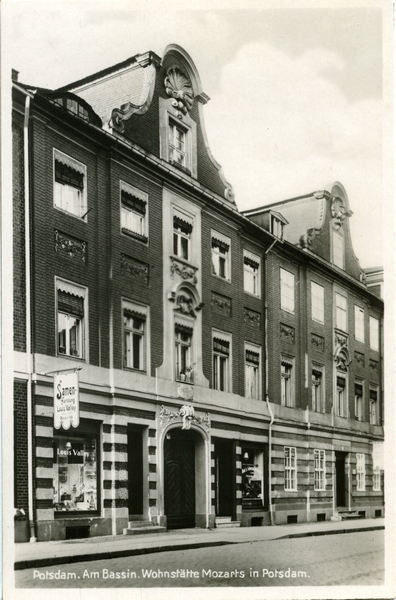 Text auf der Karte: Potsdam. Am Bassin. Wohnstätte Mozarts in Potsdam. (Samenhandlung Louis Valley) Entstehungszeit der Karte: ca. 1935 Straße und Hausnummer: Am Bassin 10 Kartenart: Ansichtskarte Kartentechnik: SW-Foto Verlag: Verlag Piek, Potsdam. Gelaufen/ungelaufen: ungelaufen Zustand (I=sehr gut bis V=mangelhaft): IV Häufigkeit (h=häufig bis rrr=sehr selten): h Heutige(r) Straßenname(n): Am Bassin