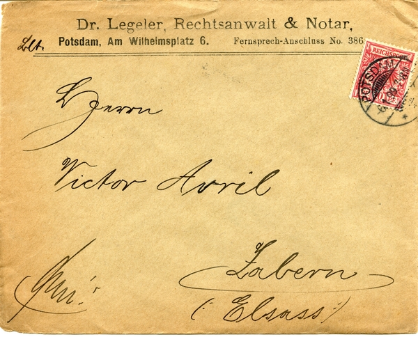 Text auf der Karte: Kuvert Dr. Legeler, Rechtsanwalt & Notar, Potsdam, Am Wilhelmsplatz 6. Fernsprech-Anschluss No. 386. Entstehungszeit der Karte: gestempelt Potsdam 06.01.1899 Straße und Hausnummer: Wilhelmplatz 6 Kartenart: Kuvert Kartentechnik: Druck Verlag: unbekannt Gelaufen/ungelaufen: gelaufen Zustand (I=sehr gut bis V=mangelhaft): II Häufigkeit (h=häufig bis rrr=sehr selten): h Heutige(r) Straßenname(n): Platz der Einheit