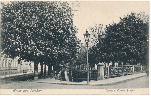 Text auf der Karte: Gruss aus Potsdam. Kanal u. Eiserne Brücke Entstehungszeit der Karte: gestempelt Potsdam 24.09.1916 Straße und Hausnummer: Am Kanal Kartenart: Ansichtskarte Kartentechnik: SW-Litho Verlag: Kunstverlag J. Goldiner, Berlin C. 25. Orig. Aufn. Otto Hasselkampf, Potsdam. Gelaufen/ungelaufen: gelaufen Zustand (I=sehr gut bis V=mangelhaft): I Häufigkeit (h=häufig bis rrr=sehr selten): r Heutige(r) Straßenname(n): Dortustraße Yorckstraße Kommentar: Die Waisenbrücke wurde 1887 errichtet. (Quelle: Gülzow, Albrecht / Herrmann, Peter Der Potsdamer Stadtkanal, Potsdam, 1997, Seite 82)