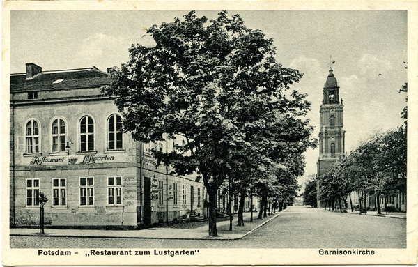 Text auf der Karte: Potsdam - "Restaurant zum Lustgarten" Garnisonkirche Inh. Carl Bust Entstehungszeit der Karte: ca. 1925 Straße und Hausnummer: Schloß-Straße 14 Kartenart: Ansichtskarte Kartentechnik: SW-Foto Verlag: 1930 Graph. Kunstanstalt W. Meyerheim, Berlin O 27 Gelaufen/ungelaufen: ungelaufen Zustand (I=sehr gut bis V=mangelhaft): I Häufigkeit (h=häufig bis rrr=sehr selten): h Heutige(r) Straßenname(n): Schloßstraße