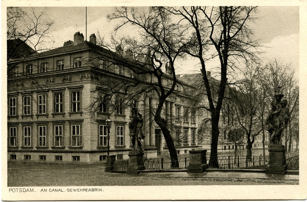 Text auf der Karte: POTSDAM. AM CANAL. GEWEHRFABRIK. Entstehungszeit der Karte: ca. 1911 Straße und Hausnummer: An der Gewehrfabrik Kartenart: Ansichtskarte Kartentechnik: Kupfertiefdruck Verlag: Verlag u. Phot. Von Susanne Homann, Werkstätte für moderne Lichtbildkunst Darmstadt 1911. Jeglicher Nachdruck verboten. Serie 46. No. 6. Gelaufen/ungelaufen: ungelaufen Zustand (I=sehr gut bis V=mangelhaft): I Häufigkeit (h=häufig bis rrr=sehr selten): h Heutige(r) Straßenname(n): Hoffbauerstraße Kommentar: 1722 gründeten die Bankiers David Splittgerber und Gottfried Adolph Daum im Auftrage Friedrich Wilhelms I. die Gewehrfabrik mit Sitz in Potsdam und Spandau. 1755/1756 errichtete der Architekt Johann Gottfried Büring einen repräsentativen, zweieinhalbgeschossigen Putzbau als Wohnsitz für den Kommissar und Direktor der Gewehrfabrik auf dem Eckgrundstück Breite Straße/An der Gewehrfabrik (Hoffbauerstraße). Angesichts der Stierkopfreihe in Sandstein nannte der Volksmund das Haus auch Ochsenkopfhaus.