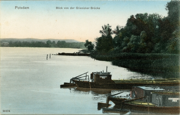 Text auf der Karte: Potsdam Blick von der Glienicker Brücke Entstehungszeit der Karte: ca. 1907 Kartenart: Ansichtskarte Kartentechnik: Kol. Litho Verlag: Reinicke & Rubin, Magdeburg, 1907. Serien-Nr. 20434 Gelaufen/ungelaufen: ungelaufen Zustand (I=sehr gut bis V=mangelhaft): I Häufigkeit (h=häufig bis rrr=sehr selten): h Kommentar: Die Lastkähne im Vordergrund könnten im Zusammenhang mit dem Bau der Glienicker Brücke (Einweihung 1907) stehen.
