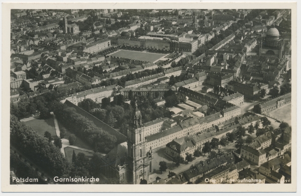 Text auf der Karte: Potsdam Garnisonkirche Orig.-Fliegeraufnahme Entstehungszeit der Karte: ca. 1939 Straße und Hausnummer: Breite Straße Kartenart: Ansichtskarte Kartentechnik: SW-Foto Verlag: Aero-Bild-Verlag, Leipzig C 1 Gelaufen/ungelaufen: ungelaufen Zustand (I=sehr gut bis V=mangelhaft): I Häufigkeit (h=häufig bis rrr=sehr selten): h Heutige(r) Straßenname(n): Breite Straße (Nördliche Innenstadt)