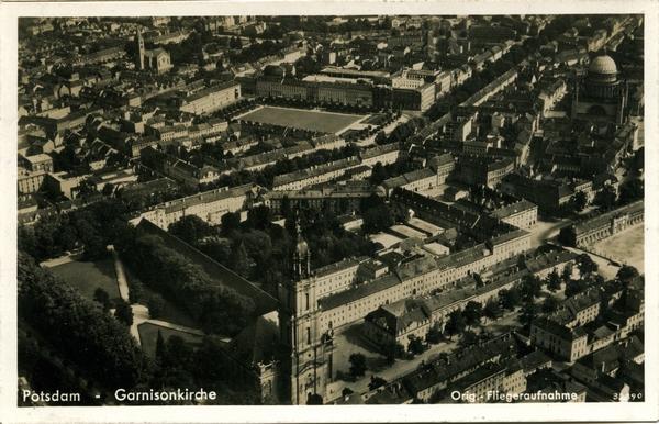 Text auf der Karte: Potsdam - Garnisonkirche Orig.-Fliegeraufnahme