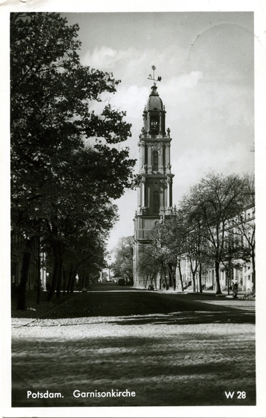 Text auf der Karte: Potsdam. Garnisonkirche Entstehungszeit der Karte: gestempelt 20.07.1942 Straße und Hausnummer: Breite Straße 7 Kartenart: Ansichtskarte Kartentechnik: SW-Foto Verlag: Georg Klemm Ansichtskarten-Verlag, Berlin NW 7 Friedrichstr. 106 Gelaufen/ungelaufen: gelaufen Zustand (I=sehr gut bis V=mangelhaft): II Häufigkeit (h=häufig bis rrr=sehr selten): h Heutige(r) Straßenname(n): Breite Straße (Nördliche Innenstadt)
