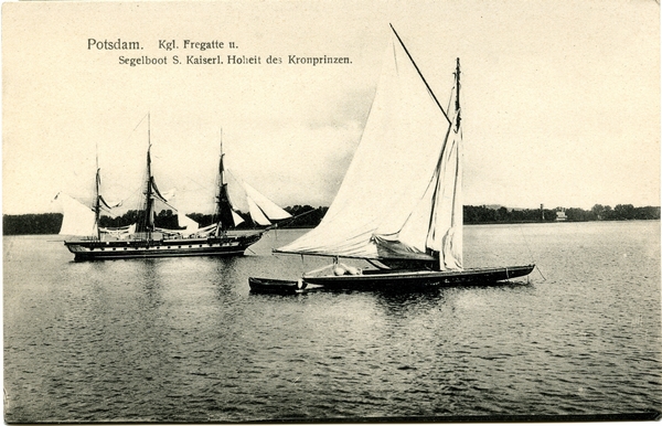 Text auf der Karte: Potsdam. Kgl. Fregatte u. Segelboot S. Kaiserl. Hoheit des Kronprinzen. Entstehungszeit der Karte: ca. 1915 Kartenart: Ansichtskarte Kartentechnik: SW-Litho Verlag: Original-Aufnahme H. P. No. 59. Gelaufen/ungelaufen: ungelaufen Zustand (I=sehr gut bis V=mangelhaft): I Häufigkeit (h=häufig bis rrr=sehr selten): r