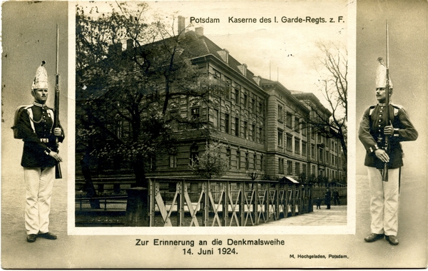 Text auf der Karte: Potsdam Kaserne des I. Garde-Regts. z. F. Zur Erinnerung an die Denkmalsweihe 14. Juni 1924. Entstehungszeit der Karte: gestempelt 07.05.1929 Straße und Hausnummer: An der Gewehrfabrik Kartenart: Ansichtskarte Kartentechnik: SW-Foto Verlag: M. Hochgeladen, Potsdam. Gelaufen/ungelaufen: gelaufen Zustand (I=sehr gut bis V=mangelhaft): I Häufigkeit (h=häufig bis rrr=sehr selten): h Heutige(r) Straßenname(n): Hoffbauerstraße