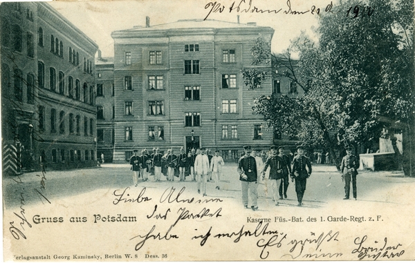 Text auf der Karte: Gruss aus Potsdam Kaserne Füs.-Bat. des 1. Garde-Regt. z. F. Entstehungszeit der Karte: gestempelt Potsdam 21.10.1900 Straße und Hausnummer: An der Gewehrfabrik Kartenart: Ansichtskarte Kartentechnik: SW-Litho Verlag: Verlagsanstalt Georg Kaminsky, Berlin W. 8 Dess. 36 Gelaufen/ungelaufen: gelaufen Zustand (I=sehr gut bis V=mangelhaft): II Häufigkeit (h=häufig bis rrr=sehr selten): r Heutige(r) Straßenname(n): Hoffbauerstraße Kommentar: Die Kaserne wird heute vom Brandenburgischen Innenministerium genutzt und trägt den Buchstaben N. (Quelle: Bauer, Frank u. Knitter, Hartmut u. Ruppert, Heinz Vernichtet - Vergessen - Verdrängt Militärbauten und militärische Denkmäler in Potsdam, Verlag E. S. Mittler & Sohn, Berlin, Bonn, Herford, 1993, Seite 19 ff.)