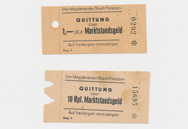 Text auf der Karte: Quittungen über Marktstandsgeld Entstehungszeit der Karte: ca. 1930 Kartenart: Quittung Kartentechnik: Druck Verlag: unbekannt Gelaufen/ungelaufen: gelaufen Zustand (I=sehr gut bis V=mangelhaft): I Häufigkeit (h=häufig bis rrr=sehr selten): h