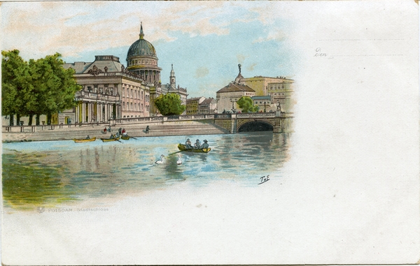 Text auf der Karte: POTSDAM Stadtschloss (signiert TvE) Entstehungszeit der Karte: ca. 1895 Kartenart: Ansichtskarte Kartentechnik: Farblitho Verlag: unbekannt Gelaufen/ungelaufen: ungelaufen Zustand (I=sehr gut bis V=mangelhaft): I Häufigkeit (h=häufig bis rrr=sehr selten): h