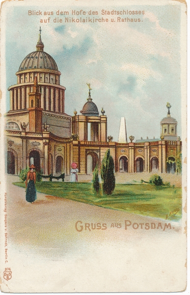 Text auf der Karte: Gruss aus Potsdam. Blick aus dem Hofe des Stadtschlosses auf die Nikolaikirche u. Rathaus. (Künstlerkarte signiert A. Heide) Entstehungszeit der Karte: ca. 1900 Straße und Hausnummer: Alter Markt 1 Kartenart: Ansichtskarte Kartentechnik: kol. Litho Verlag: Kunstverlag Seegers u. Sehrndt, Berlin C. Gelaufen/ungelaufen: ungelaufen Zustand (I=sehr gut bis V=mangelhaft): II Häufigkeit (h=häufig bis rrr=sehr selten): h Heutige(r) Straßenname(n): Alter Markt