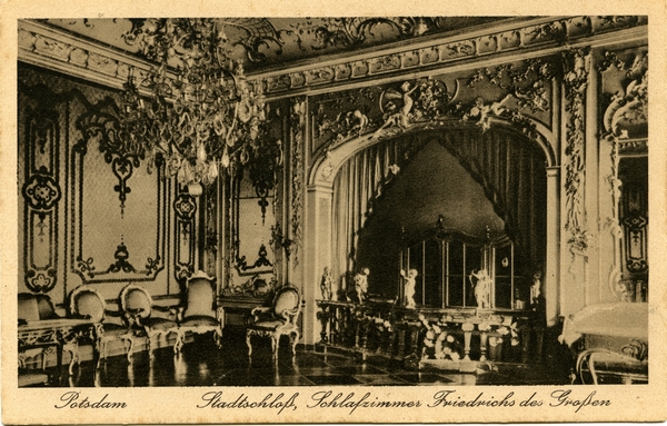 Text auf der Karte: Potsdam Stadtschloß, Schlafzimmer Friedrichs des Großen Entstehungszeit der Karte: ca. 1925 Straße und Hausnummer: Alter Markt 1 Kartenart: Ansichtskarte Kartentechnik: Kupfertiefdruck Verlag: Verlag Piek, Potsdam Gelaufen/ungelaufen: ungelaufen Zustand (I=sehr gut bis V=mangelhaft): I Häufigkeit (h=häufig bis rrr=sehr selten): h Heutige(r) Straßenname(n): Alter Markt