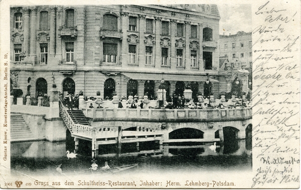 Text auf der Karte: Gruss aus dem Schultheiss-Restaurant, Inhaber: Herm. Lehmberg-Potsdam. Entstehungszeit der Karte: gestempelt Potsdam 18.03.1901 Kartenart: Ansichtskarte Kartentechnik: SW-Litho Verlag: Gustav Kisow, Kunstverlags-Anstalt, Berlin S. 59. Gelaufen/ungelaufen: gelaufen Zustand (I=sehr gut bis V=mangelhaft): II Häufigkeit (h=häufig bis rrr=sehr selten): h