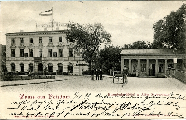 Text auf der Karte: Gruss aus Potsdam. Eisenbahn-Hôtel u. Altes Steuerhaus. Entstehungszeit der Karte: gestempelt 01.12.1899 Kartenart: Ansichtskarte Kartentechnik: SW-Litho Verlag: Kunstverlag J. Goldiner, Berlin. Gelaufen/ungelaufen: gelaufen Zustand (I=sehr gut bis V=mangelhaft): II Häufigkeit (h=häufig bis rrr=sehr selten): r Kommentar: Am Ende der Langen Brücke stand das tiefergelegene Eisenbahn-Hotel. Das eine der beiden Teltower Torhäuschen ließ man beim Abriß der 1825 erbauten Brücke stehen. (Quelle: Lieberenz, Siegfried Ausstellung in den Bahnhofspassagen Potsdam "Gaststätten in Potsdam", Potsdam, Juli 2005, Seite )