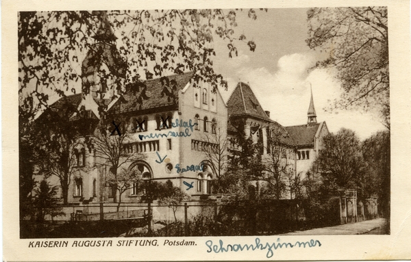 Text auf der Karte: KAISERIN AUGUSTA STIFTUNG. Potsdam. Entstehungszeit der Karte: ca. 1925 Straße und Hausnummer: Albrechtstraße 20-24 (heute: 30- Kartenart: Ansichtskarte Kartentechnik: Kupfertiefdruck Verlag: Verlag A. Hellwig, Potsdam, Nauener Str. 6 Gelaufen/ungelaufen: ungelaufen Zustand (I=sehr gut bis V=mangelhaft): I Häufigkeit (h=häufig bis rrr=sehr selten): h Heutige(r) Straßenname(n): Leistikowstraße Am Neuen Garten Kommentar: Am 21.10.1902 konnten 66 Zöglinge und 8 Erzieherinnen in das Augusta-Stift einziehen. Nach dem 2. Weltkrieg wurde das Gelände in Vorbereitung der Potsdamer Konferenz gesperrt und das Gebäude später durch den KGB beschlagnahmt; den Internatsbetrieb erhielt man bis 1958 in der Friedrich-Ebert-Str. 60 aufrecht. 1947 wurde das Internat in eine kirchliche Einrichtung umgewandelt und dem Provinzialausschuss für Innere Mission unterstellt. Am 03.11.1997 erfolgte mit der Umbenennung in "Kaiserin-Augusta-Stiftung in Potsdam" auch die Änderung des Statuts, wonach die Bildung und Ausbildung von Kindern, Jugendlichen und Erwachsenen sowie Schulen in diakonischer Trägerschaft fördert. (Quelle: Wernicke, Thomas; Götzmann, Jutta; Winkler, Kurt (Herausgeber) Potsdam Lexikon Stadtgeschichte von A bis Z, Berlin, 2010, Seite 218)