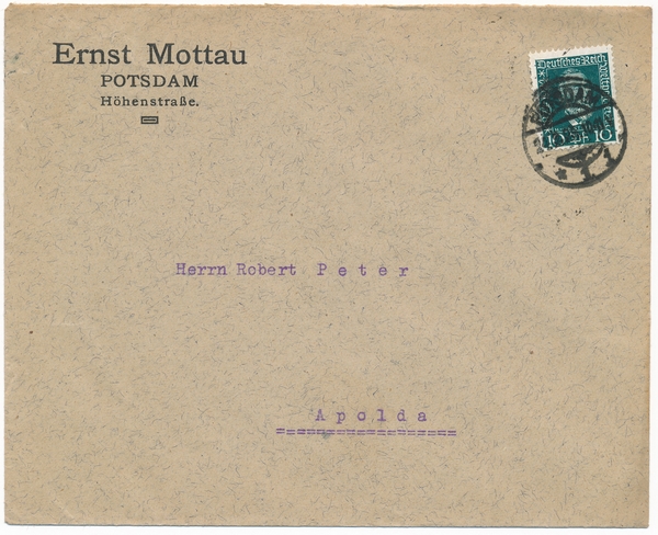 Text auf der Karte: Kuvert von Ernst Mottau Potsdam Höhenstraße. Der Adressat Robert Peter ein Wollwarenfabrikant aus Apolda und Kunstmäzen. Entstehungszeit der Karte: gestempelt Potsdam (Datum unleserlich) ca. 1920er Straße und Hausnummer: Höhenstraße 5 Kartenart: Kuvert Kartentechnik: SW-Druck Verlag: unbekannt Gelaufen/ungelaufen: gelaufen Zustand (I=sehr gut bis V=mangelhaft): I Häufigkeit (h=häufig bis rrr=sehr selten): h Heutige(r) Straßenname(n): Höhenstraße Kommentar: Das unter Denkmalschutz stehende Haus Nr. 5 war das erste, das in der Höhenstraße gebaut wurde.