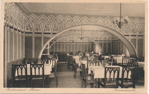 Text auf der Karte: Restaurant Meierei Innenansicht Rückseitig: Inh.: Fritz Wolske - Telefon: Potsdam 1017 Autobusverbindung vom Hauptbahnhof bis Meierei Entstehungszeit der Karte: gestempelt Berlin 20.09.1942 Straße und Hausnummer: Neuer Garten Kartenart: Ansichtskarte Kartentechnik: Kupfertiefdruck Verlag: Arthur Redecker, Berlin-Tempelhof. Gelaufen/ungelaufen: gelaufen Zustand (I=sehr gut bis V=mangelhaft): I Häufigkeit (h=häufig bis rrr=sehr selten): h Heutige(r) Straßenname(n): Im Neuen Garten