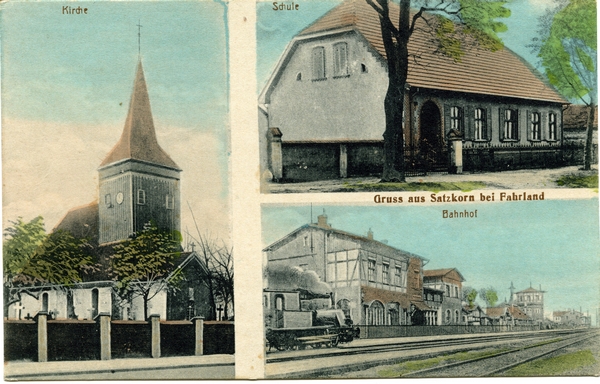 Text auf der Karte: Gruss aus Satzkorn bei Fahrland Kirche Schule Bahnhof Entstehungszeit der Karte: ca. 1910 Kartenart: Ansichtskarte Kartentechnik: Kol. Litho Verlag: 5268 Kunstanstalt Max Zibell, Berlin N. 58, Hiddensoeer Str. 4 Gelaufen/ungelaufen: ungelaufen Zustand (I=sehr gut bis V=mangelhaft): I Häufigkeit (h=häufig bis rrr=sehr selten): h