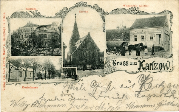 Text auf der Karte: Gruss aus Kartzow Wegener's Gasthof (Carl Wegener) Kirche Schloss Dorfstrasse Entstehungszeit der Karte: gestempelt 22.05.1903 Kartenart: Ansichtskarte Kartentechnik: SW-Litho Verlag: Verlag von Carl Mewes, Maler u. Photograph in Ketzin. Gelaufen/ungelaufen: Feldpost Zustand (I=sehr gut bis V=mangelhaft): I Häufigkeit (h=häufig bis rrr=sehr selten): r Kommentar: Die Kirche in der Dorfstraße des Ortsteils Kartzow wurde von Theodor Prüfer unter Kaiser Wilhelm I. erbaut. Die frühere Kirche fiel einem verheerenden Dorfbrand 1873 zum Opfer. Offenbar unter Verwendung der Feldsteine vom Vorgängerbau entstand 1885/1886 ein vier Joche langer Saalbau mit Satteldach im neoromanisch-neogotischen Übergangsstil. Im Westen in ein Turm über quadratischen Grundriss mit steile Pyramidenspitze, und diesem wiederum eine hölzerne, offene Eingangshalle vorgelagert. Die älteste Glocke von 1886 verweist inschriftlich auf den Architekten der Kirche; die beiden anderen wurden in Apolda gegossen. Östlich schließt sich ein 5/8-Chor an. In dessen Nähe befindet sich der südlich angrenzende Sakristeianbau. Östlich des Chors hat sich ein frühmittelalterliches Sühnekreuz erhalten. (Quelle: Wernicke, Thomas; Götzmann, Jutta; Winkler, Kurt (Herausgeber) Potsdam Lexikon Stadtgeschichte von A bis Z, Berlin, 2010, Seite 220 f.)