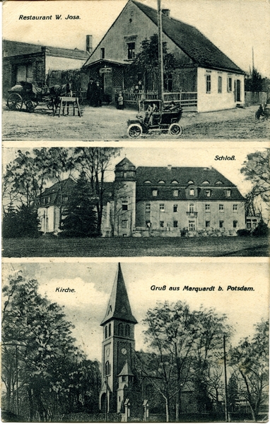 Text auf der Karte: Gruß aus Marquardt b. Potsdam Restaurant W. Josa. Schloß. Kirche. Entstehungszeit der Karte: gestempelt 22.1?.1926 Kartenart: Ansichtskarte Kartentechnik: SW-Litho Verlag: Verlag; Wilhelm Meyer, Neukölln, Treptower Str. 43 Gelaufen/ungelaufen: gelaufen Zustand (I=sehr gut bis V=mangelhaft): I Häufigkeit (h=häufig bis rrr=sehr selten): h