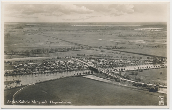 Text auf der Karte: Angler-Kolonie Marquardt, Fliegeraufnahme. Entstehungszeit der Karte: gestempelt 02.08.1932 Kartenart: Ansichtskarte Kartentechnik: SW-Foto Verlag: Verlag Arbeiter-Angler-Bund Deutschlands E. V., Berlin. Foto und Rechte Klinke & Co., Berlin, Flughafen. Gelaufen/ungelaufen: gelaufen Zustand (I=sehr gut bis V=mangelhaft): I Häufigkeit (h=häufig bis rrr=sehr selten): h