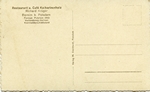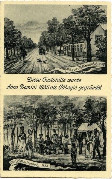 Text auf der Karte: Diese Gaststätte wurde Anno Domini 1835 als Tabagie gegründet rückseitig: Restaurant u. Café Katharinenholz Richard Krüger Bornim b. Potsdam Fernspr. Potsdam 3983 Verbandskegelbahnen Kleinkaliberschießstand