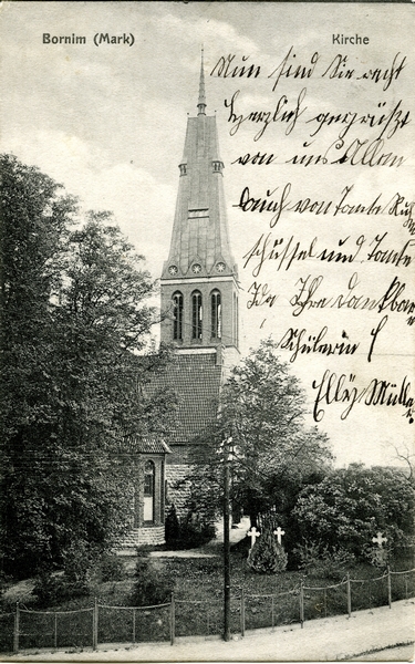 Text auf der Karte: Bornim (Mark) Kirche Gruß vom Gasthof zum alten Krug (H. Berlin) Bornim i. Mark Entstehungszeit der Karte: gestempelt ca. 1910 Kartenart: Ansichtskarte Kartentechnik: SW-Litho Verlag: unbekannt Gelaufen/ungelaufen: gelaufen Zustand (I=sehr gut bis V=mangelhaft): I Häufigkeit (h=häufig bis rrr=sehr selten): h