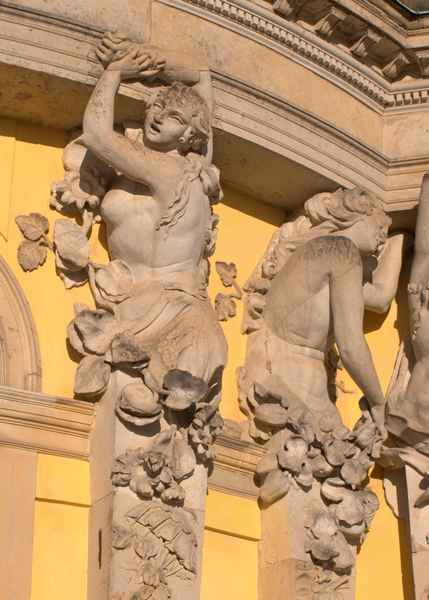 Text auf der Karte: Sanssouci: Figuren am Schloss Max Baur P77Aufnahmedatum des Vergleichsfotos: 11.01.2014© Copyright des Fotografen: Helmut MatzKarten-Nr. bei GrussAusPotsdam.de: 684