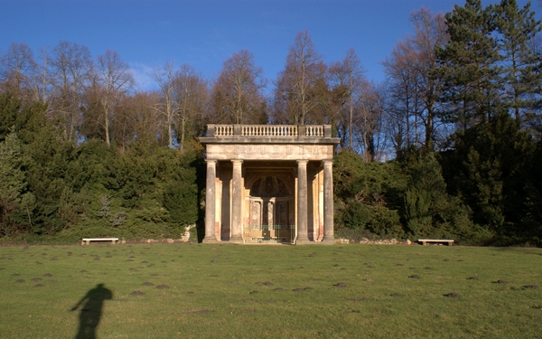 Text auf der Karte: Nordischer Garten mit Grotte und Standbild "Der Fechter"