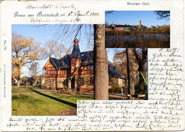 Text auf der Karte: Gruss aus Bornstedt Kronen-Gut.Aufnahmedatum des Vergleichsfotos: 20.11.2025© Copyright des Fotografen: Helmut MatzHeutige(r) Straßenname(n): SchulplatzRibbeckstraßeKarten-Nr. bei GrussAusPotsdam.de: 797