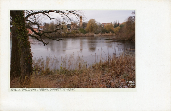 Text auf der Karte: IDYLL A. D. UMGEBUNG v. POTSDAM. BORNSTEDTER SEE u. KIRCHE. Künstlerkarte von Wilhelm Thiele Potsdam