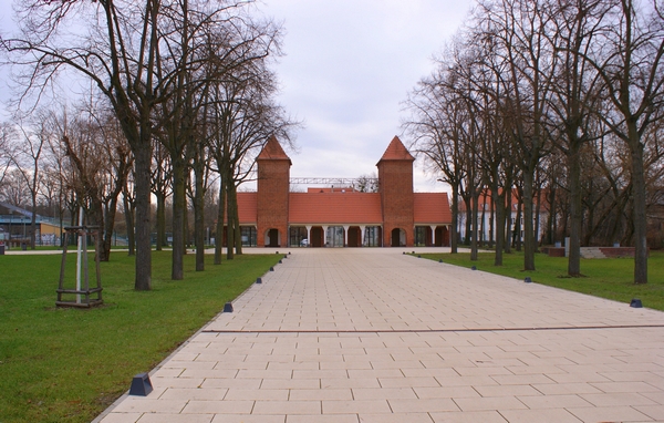 Text auf der Karte: Potsdam. Eingang z. Sportplatz Luftschiffhafen mit dem Diskuswerfer.