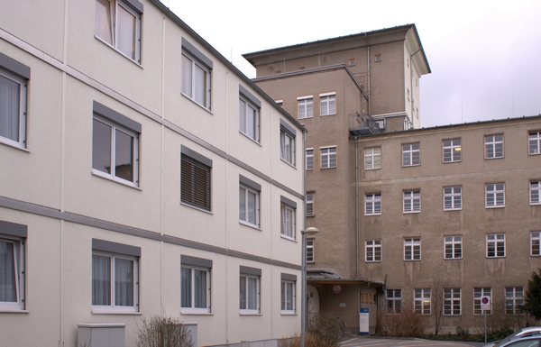 Text auf der Karte: Potsdam. Krankenhaus und Poliklinik.Aufnahmedatum des Vergleichsfotos: 15.01.2014© Copyright des Fotografen: Helmut MatzHeutige(r) Straßenname(n): Berliner StraßeKarten-Nr. bei GrussAusPotsdam.de: 827