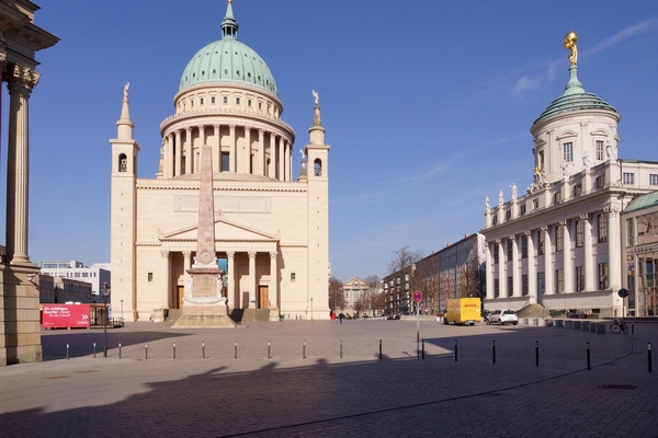 Text auf der Karte: Potsdam. Nikolaikirche - RathausAufnahmedatum des Vergleichsfotos: 01.03.2018© Copyright des Fotografen: Helmut MatzHeutige(r) Straßenname(n): Am alten MarktKarten-Nr. bei GrussAusPotsdam.de: 2.516