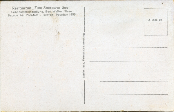 Text auf der Karte: Restr. Zum Sacrower See Partie zum See rückseitig: Restaurant "Zum Sacrower See" Lebensmittelhandlung, Bes. Walter Niese, Sacrow bei Potsdam - Telefon: Potsdam 1456