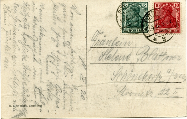 Text auf der Karte: Sanssouci Paradiesgarten - Treppenfontaine Entstehungszeit der Karte: gestempelt Potsdam 12.04.1920 Straße und Hausnummer: Park Sanssouci Kartenart: Ansichtskarte Kartentechnik: SW-Litho Verlag: R. Steinbrück, Sanssouci Gelaufen/ungelaufen: gelaufen Zustand (I=sehr gut bis V=mangelhaft): I Häufigkeit (h=häufig bis rrr=sehr selten): h