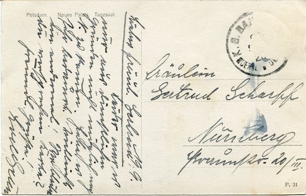 Text auf der Karte: Potsdam Neues Palais Tanzsaal Entstehungszeit der Karte: ca. 1920 Straße und Hausnummer: Park Sanssouci Kartenart: Ansichtskarte Kartentechnik: SW-Litho Verlag: P. 31 Gelaufen/ungelaufen: gelaufen Zustand (I=sehr gut bis V=mangelhaft): III Häufigkeit (h=häufig bis rrr=sehr selten): h