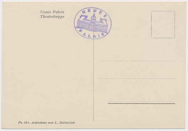 Text auf der Karte: Neues Palais Theatertreppe Entstehungszeit der Karte: ca. 1930 Straße und Hausnummer: Park Sanssouci Kartenart: Ansichtskarte Kartentechnik: SW-Foto Verlag: Po. 304. Aufnahme von L. Herbschleb Gelaufen/ungelaufen: ungelaufen Zustand (I=sehr gut bis V=mangelhaft): I Häufigkeit (h=häufig bis rrr=sehr selten): r