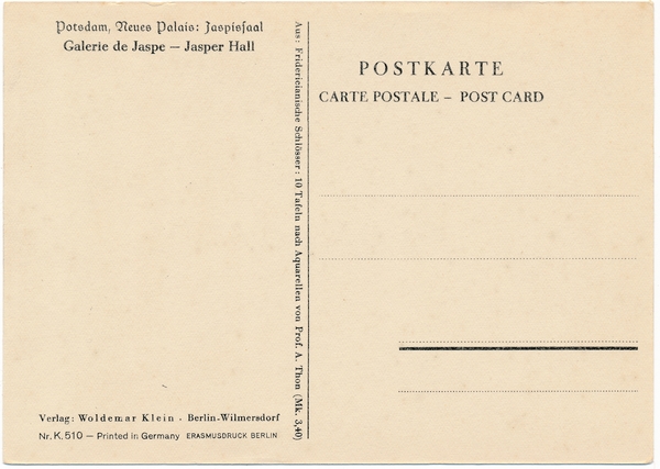 Text auf der Karte: Potsdam, Neues Palais: Jaspissaal Galerie de Jaspe - Jasper Hall Aus: Fridericianische Schlösser: 10 Tafeln nach Aquarellen von Prof. A. Thon (Mk. 3,40) Entstehungszeit der Karte: ca. 1935 Straße und Hausnummer: Park Sanssouci Kartenart: Ansichtskarte Kartentechnik: Farbdruck Verlag: Verlag: Woldemar Klein . Berlin-Wilmersdorf Nr. K 510 Gelaufen/ungelaufen: ungelaufen Zustand (I=sehr gut bis V=mangelhaft): I Häufigkeit (h=häufig bis rrr=sehr selten): h