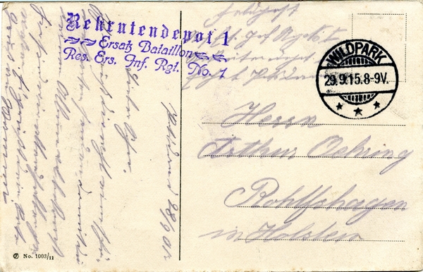 Text auf der Karte: Potsdam Neues Palais, Gartenanlage Entstehungszeit der Karte: gestempelt 29.09.1915 Straße und Hausnummer: Park Sanssouci Kartenart: Ansichtskarte Kartentechnik: SW-Litho Verlag: No. 1003/11 Gelaufen/ungelaufen: Feldpost Zustand (I=sehr gut bis V=mangelhaft): II Häufigkeit (h=häufig bis rrr=sehr selten): h