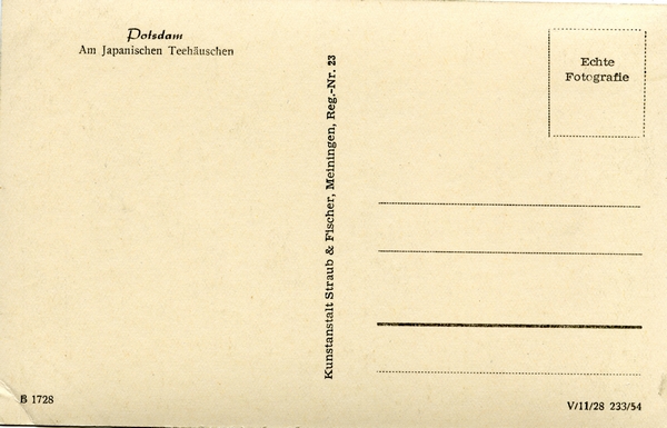 Text auf der Karte: Potsdam Am Japanischen Teehäuschen Entstehungszeit der Karte: ca. 1935 Straße und Hausnummer: Park Sanssouci Kartenart: Ansichtskarte Kartentechnik: SW-Foto Verlag: Kunstanstalt Straub & Fischer, Meinigen, Reg.-Nr. 23 Gelaufen/ungelaufen: ungelaufen Zustand (I=sehr gut bis V=mangelhaft): III Häufigkeit (h=häufig bis rrr=sehr selten): h
