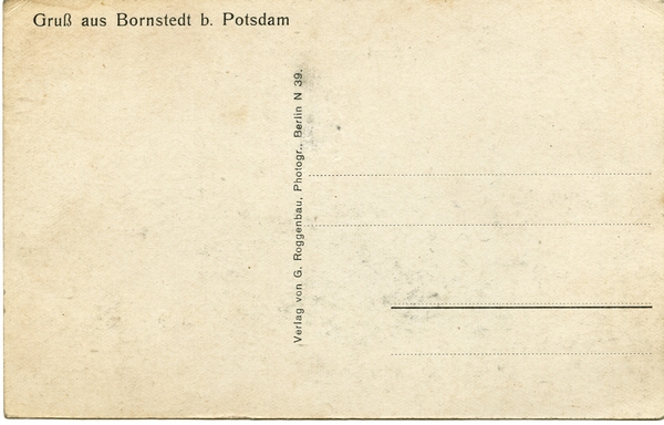 Text auf der Karte: Gruß aus Bornstedt b. Potsdam Jugendheim mit Dorfstraße Entstehungszeit der Karte: ca. 1915 Kartenart: Ansichtskarte Kartentechnik: SW-Litho Verlag: Verlag von G. Roggenbau, Photogr., Berlin N 39. Gelaufen/ungelaufen: ungelaufen Zustand (I=sehr gut bis V=mangelhaft): I Häufigkeit (h=häufig bis rrr=sehr selten): r Heutige(r) Straßenname(n): Potsdamer Straße (Bornstedt) Schulplatz