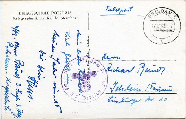 Text auf der Karte: Kriegsschule Potsdam Kriegerplastik an der Haupteinfahrt Entstehungszeit der Karte: gestempelt Potsdam 27.12.1940 Straße und Hausnummer: Kirschallee Kartenart: Ansichtskarte Kartentechnik: SW-Foto Verlag: 2157. Max Baur Verlag, Potsdam. Gelaufen/ungelaufen: Feldpost Zustand (I=sehr gut bis V=mangelhaft): I Häufigkeit (h=häufig bis rrr=sehr selten): r Heutige(r) Straßenname(n): Kirschallee Kommentar: Bereits 1934 setzten am südwestlichen Rand des Bornstedter Feldes die Bauarbeiten für die neue Potsdamer Kriegsschule ein. Die Eröffnung erfolgte am 9. Januar 1936. (Quelle: Knitter, Hartmut / Lamprecht, Rainer Rund um das Bornstedter Feld - Streiflichter zur Geschichte des Potsdamer Nordraumes, Potsdam 2006, Seite 162 ff.)