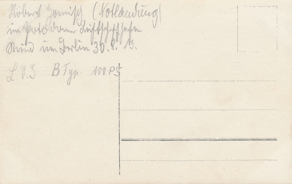 Text auf der Karte: Robert Garmisch (Notlandung) im Potsdamer Luftschiffhafen Rund um Berlin 30.08.1913 L.V. B Typ 100 PS Entstehungszeit der Karte: ca. 1913 Straße und Hausnummer: Am Templiner See Kartenart: Fotokarte Kartentechnik: SW-Foto Verlag: unbekannt Gelaufen/ungelaufen: ungelaufen Zustand (I=sehr gut bis V=mangelhaft): I Häufigkeit (h=häufig bis rrr=sehr selten): rrr Heutige(r) Straßenname(n): Am Luftschiffhafen